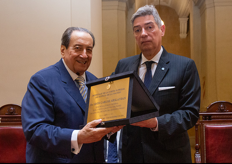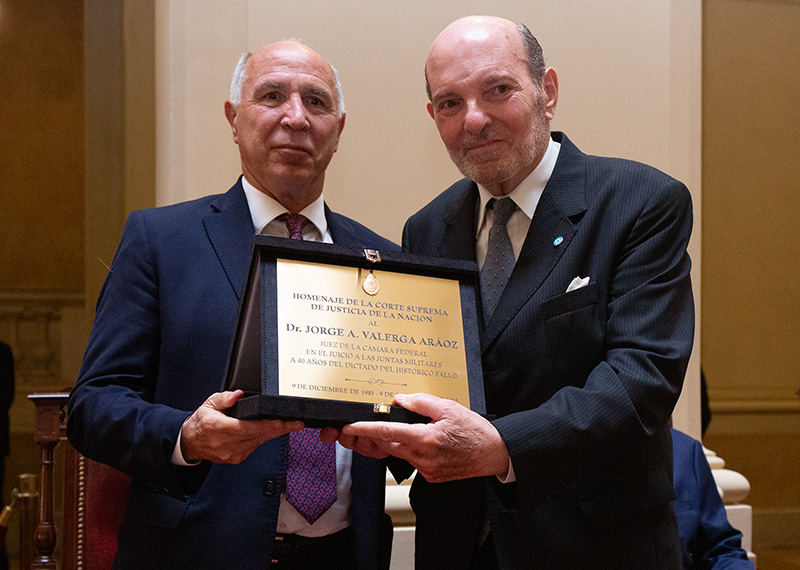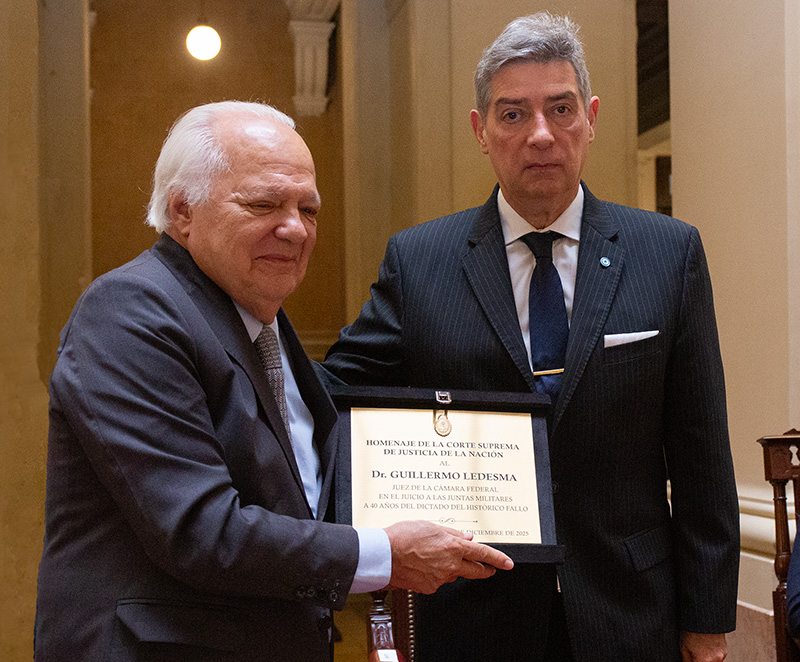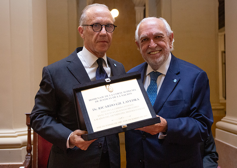 En tanto, el ministro de la Corte Ricardo Lorenzetti remarcó que los homenajeados “han elevado el prestigio de la institución” ya que “no solo firmaron un fallo: también generaron un texto que integra la memoria de los argentinos; mostraron coherencia, imparcialidad y templanza para resolver en un contexto difícil, e inauguraron una política de Estado que todos los jueces y juezas han sabido continuar a lo largo del tiempo”. Al respecto, enfatizó que “la política de memoria y justicia ya forma parte del contrato social de los argentinos”.